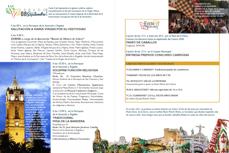 La fiesta del 8 de septiembre se abría a las 12 de la noche con la salutación a la Virgen en su festividad, que tuvo lugar en un abarrotado templo de la Asunción. El ferial acogía una víspera con muchas personas en las casestas particulares y en la municipal. Por la mañana a las 9, partía la diana de la Banda de Música con sus clásicos sones del "Despierta Sierrita" que han anunciado musicalmente este Día de la Sierra en Cabra.
