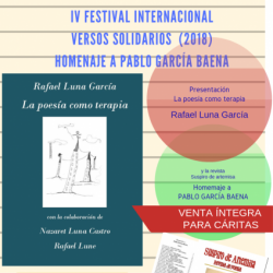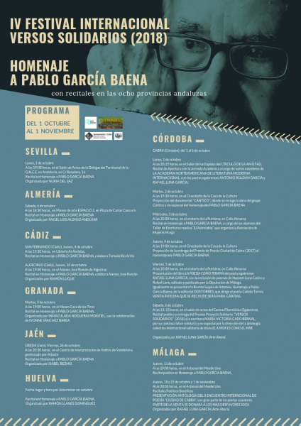 En esta cuarta edición, Versos Solidarios rendirá merecido homenaje al insigne poeta fallecido recientemente Pablo García Baena, ganador entre otros del premio Príncipe de Asturias 1984 y del premio de poesía Ciudad de Cabra 2017, con recitales de poesía en su homenaje en las ocho provincias andaluzas. En estos actos de homenaje a García Baena, se contará con la participación de poetas tan destacadas como Ángeles Mora, ganadora del premio nacional de Poesía 2016 y del premio nacional de la Crítica 2015.