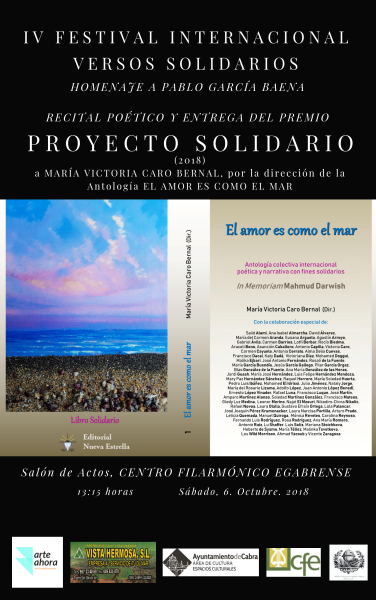 El día 6 de octubre, en el Centro Filarmónico Egabrense, se hará entrega del Premio Proyecto Solidario 2018, a la escritora Mª. Victoria Caro Bernal, por su continua labor social y en especial por la dirección de la antología colectiva internacional poética y narrativa con fines solidarios de título El amor es como el mar.