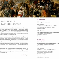 El viernes 26 de octubre intervendrá el doctor Francisco Acosta Ramírez de la Universidad de Córdoba, con una conferencia sobre Guerra y revolución en Córdoba: la Guerra de la Independencia, también a las 18:30h. A continuación cerrará las jornadas el doctor José Luis Corral de la Universidad de Zaragoza que hablará sobre El umbral de la Guerra de la Independencia. Egabrenses en Trafalgar.