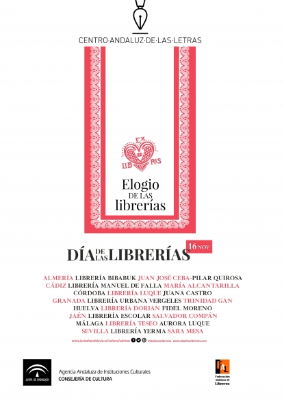 en torno al Día de las Librerías que se celebra el próximo viernes 16 de noviembre en las ocho provincias de Andalucía. La conmemoración estará dedicada a reivindicar el papel de estos espacios en la sociedad actual a través del elogio que ocho escritores y escritoras realizarán sobre una librería de su ciudad.