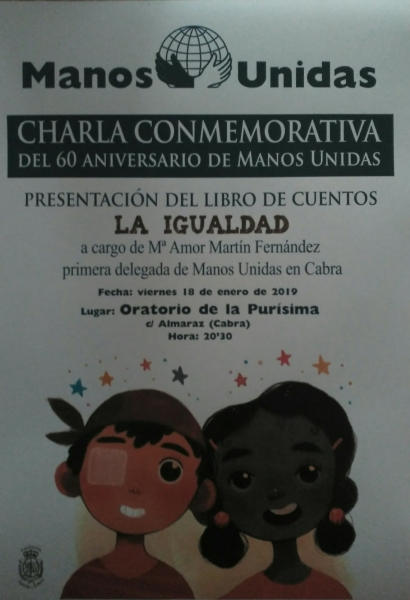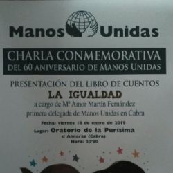 El viernes 18 de enero en el Oratorio de la Purísima (Calle Almaraz) de la Fundación Aguilar y Eslava, tendrá lugar una charla conmemorativa del 60º aniversario de Manos Unidas a cargo de la que fue primera delegada en Cabra y profesora del IES Aguilar y Eslava, Mª Amor Martín Fernández. En dicho acto se presentará también el libro de cuentos La Igualdad. Será a las 20:30 del viernes 18 de enero.