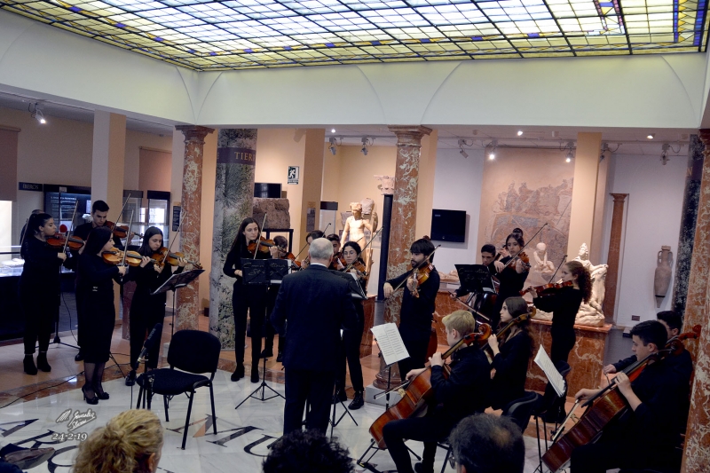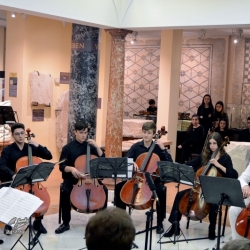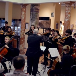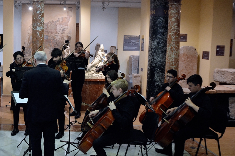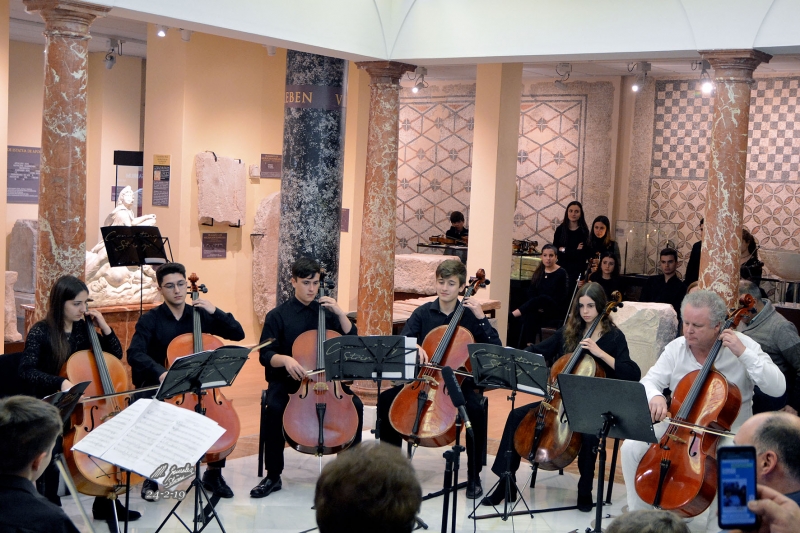 Y tras esta interpretación hubo un trasiego de atriles y sillas, para situarse en perfecta formación circular, un "ensemble" de cellos, que con la dirección de P. Schoening (que también estaba en el "ensemble" como chelista) hicieron una parte de la B.S. de la serie americana "Hawaii 5.0" de Mort Stevens/arr de Johnson. Buena ejecución que gustó y se repitió como "bis", con lo que terminó este delicioso concierto que además de por razones musicales lo fue por el marco que lo acogió, el Patio de Cristales del Museo Arqueológico de nuestra ciudad (antigua sede del Banco de España), que es una "bombonera" con las columnas de jaspe que lo circundan junto a las piezas museísticas principales.