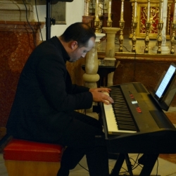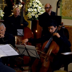 Tras ésta, la célebre "La Madrugá" (Abel Moreno Gómez) nacido en Encinasola (Huelva) (1944), marcha que describe la "madrugá" sevillana del Jueves al Viernes Santo. Su música es sencilla, agradable para el oído y de escasa dificultad para cualquier agrupación, pero hay que decirla bien. Se interpreta por diferentes conjuntos, desde grandes Bandas de Música, Orquestas Sinfónicas y un gran número de grupos como cuartetos, tríos e instrumentistas solistas. Aquí se hizo por un TRÍO: PIANO-Manuel Molina Carrillo-CHELO-Antonio Peña Ruiz-OBOE-Francisco Olmo Morales, en una versión única. ¡Qué decir! Todo lo que se diga es poco. PRECIOSA. DELICIOSA. BELLÍSIMA. EJECUCIÓN PERFECTA. La bordaron en su ejecución. "No se oía ni una mosca". Los últimos compases fueron una explosión de bravos y aplausos, que atronaron en la gran nave del templo dominico, con todo el público en pie.