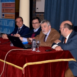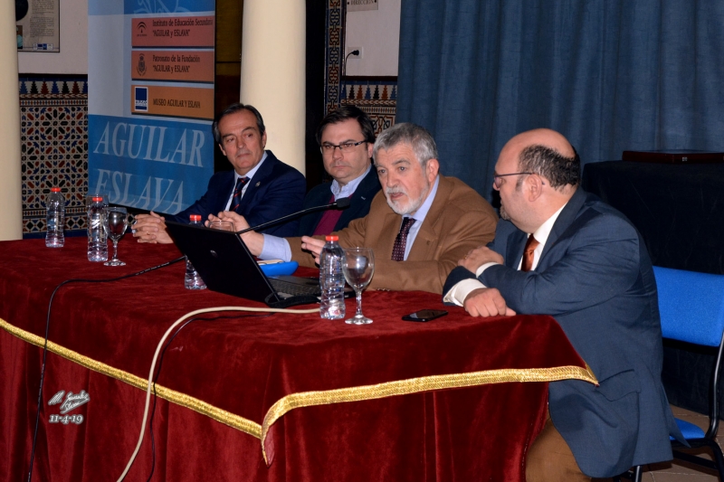 La presidencia del acto la formaban: José Luis Arrabal Maíz, concejal delegado de Cultura del Ayuntamiento de Cabra; Salvador Guzmán Moral, presidente de la Fundación Aguilar y Eslava; Jorge Manuel Rodríguez Almenar, presidente del Centro Español de Sindonología (CES) y el conferenciante, Dr. Juan Manuel Miñarro López.