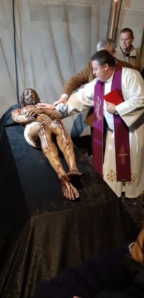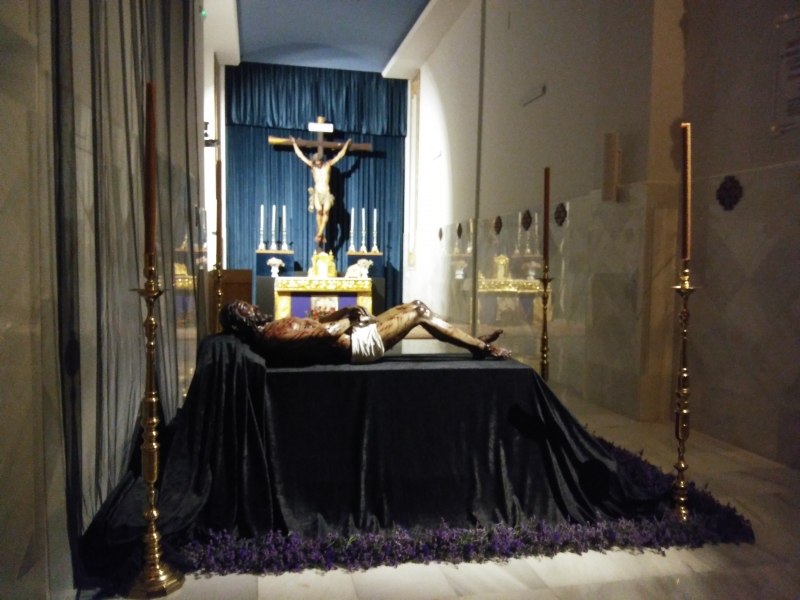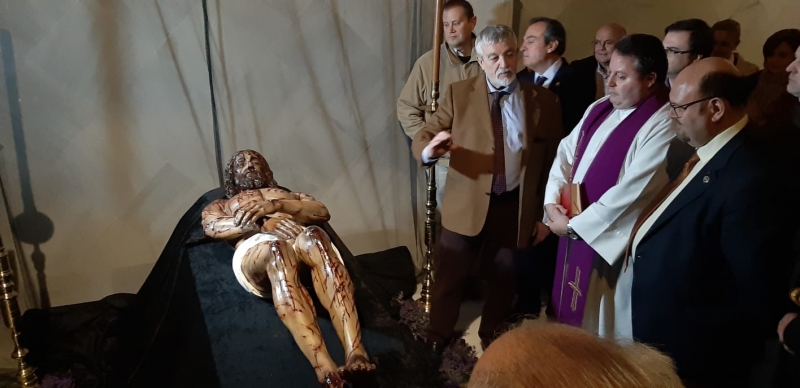 Para finalizar, todos los asistentes acudirían a ver la nueva imagen del Yacente sindónico al Oratorio de la Purísima de la Fundación Aguilar y Eslava, donde estaba expuesta sobre un catafalco negro y donde además el párroco de la Iglesia de los Remedios, Francisco Delgado - que representaba además al Obispo de la diócesis - ayudado del franscicano Fray Guillermo Triano, realizaría la ceremonia de bendición sagrada de la nueva imagen.