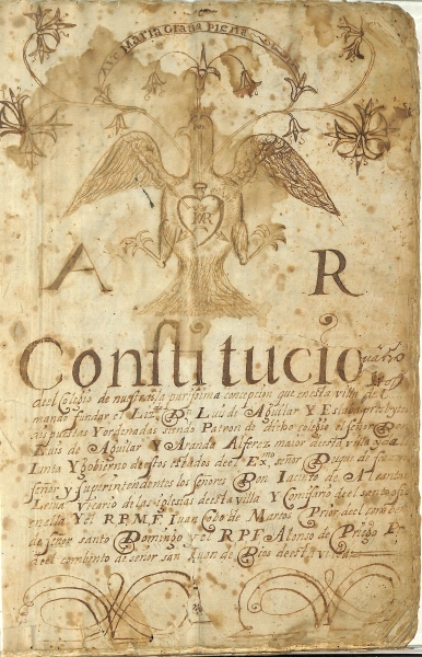01.03.05.10.0001 Constituciones del Colegio de Nuestra Purísima Concepción que en esta villa de Cabra mandó fundar el licenciado Don Luis de Aguilar y Eslava, presbítero, dispuestas y ordenadas siendo patrón de dicho Colegio el señor D. Luis de Aguilar y Aranda, alférez mayor de esta villa y de la Junta y Gobierno de estos estados del Excmo. Sr. Duque de Sessa y superintendentes los Sres. D. Jacinto de Alcántara Leyva, vicario de las iglesias de esta villa y comisario del Santo Oficio en ella y el R.P.N.F. Juan Cobo de Martos, prior del convento de Nuestro Señor Santo Domingo y el R.P.F. Alonso de Priego, prior del convento del Señor San Juan de Dios de esta villa (1700). [Sig. Top.: 33/9]