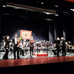 El cambio de carácter llegó con Jewish Soul Fantasy de Y. Povolotsky, arreglo de Miguel López León, y con los clarinetistas David Roldán y Víctor Herrero como solistas, impecables tanto en afinación como en expresividad en cada pasaje virtuosístico que presenta la obra. Su diálogo, lleno de inflexiones propias del repertorio klezmer, se vio realzado por una banda siempre atenta a su director, que supo sostener los planos sonoros respetando en todo momento a los solistas y con un acompañamiento muy bien equilibrado. Se trata de una fantasía basada en melodías judías tradicionales, combina escalas frigias y armónicas típicas de la tradición hebrea y ornamentación al estilo klezmer (glisandos, mordentes, portamentos...) con contrastes fuertes entre secciones festivas y otras de carácter más introspectivo. Queda sobradamente reflejado en esta versión, y en muchas otras, el gran dominio y maestría de la orquestación e instrumentación por parte de su arreglista y director, Miguel López. Hubo muchos aplausos, especialmente para los solistas ya que interpretaron un papel muy virtuosístico con total maestría, fueron obsequiados por parte de la Asociación Banda de Música de Cabra con unos ramos de flores, entregados por su presidente Rafael Sabariego Borrallo, y por Ángela Padillo, vocal de la junta directiva.