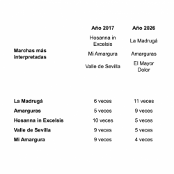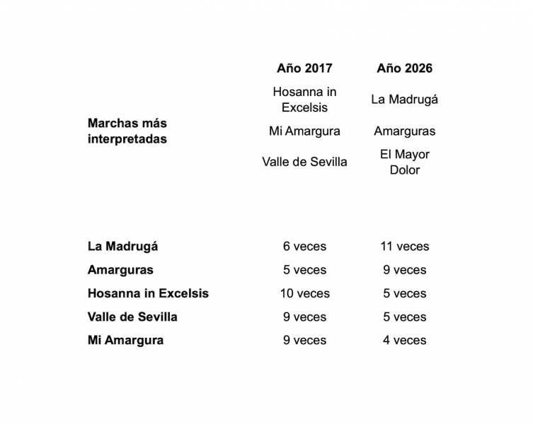 Continuando con los números totales, hay unas variaciones en las marchas más interpretadas y algunas similitudes. En primer lugar "La Madrugá" se impone en 2026 con unos datos muy claros, mientras que en el 2017 la marcha más interpretada fue "Hosanna in Excelsis". En el segundo y tercer puesto también hay variaciones. Está ocupado en 2026 por "Amarguras"(9 interpretaciones) y "El Mayor Dolor" (8 interpretaciones) mientras que en 2017 eran "Mi Amargura" y "Valle de Sevilla" con nueve interpretaciones.