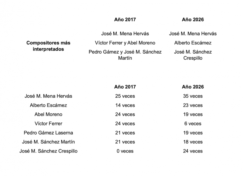 En cuanto a los compositores más interpretados, hay algunas similitudes y nuevas incorporaciones. José Manuel Mena Hervás sigue siendo el autor más interpretado, manteniendo la prevalencia desde 2017 hasta este año, aumentando incluso el número de veces que se ha tocado su música (25 en 2017 y 35 en 2026) que denota que no solo es un compositor clásico bien valorado, sino que ha continuado escribiendo nueva música que es muy bien acogida por calidad y sus líneas melódicas tan bellas. En segundo lugar se sitúa Alberto Escámez, cuyas marchas son más interpretadas, aún, que en 2017. Y en tercer lugar José Manuel Sánchez Crespillo, que si bien en 2017 tenía alguna marcha escrita, su repercusión en los repertorios era muy escasa. Pero al cabo de este tiempo, diez años prácticamente, las marchas que ha ido escribiendo han calado notablemente en las bandas, tocándose su música hasta 24 veces en la pasada Semana Santa.