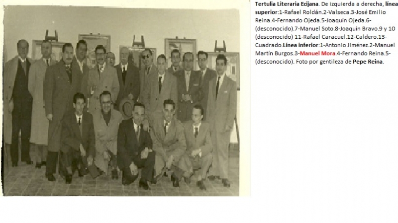 José E. Reina García (Écija, 1998: 30), miembro supernumerario de la R. A. "Luis Vélez de Guevara", destacó en el acto IN MEMÓRIAM del Ilustre Numerario D. Manuel Martín Burgos (9 de mayo de 1997) la aportación del poeta Manolo Mora Jiménez (Cabra, 1913- Écija, 1975) a la Tertulia Literaria: "representaba como nadie ese hálito poético de la atmósfera que nos envolvía...Era de ver a este, con su ligeramente temblorosa voz y su acusado lirismo, recitarnos, por ejemplo, su poema al Picadero: "Negro pañuelo tendido, en lo alto de mi pueblo", quiero recordar que comenzaba, o aquel otro poema precioso y original a un poste de telégrafos".