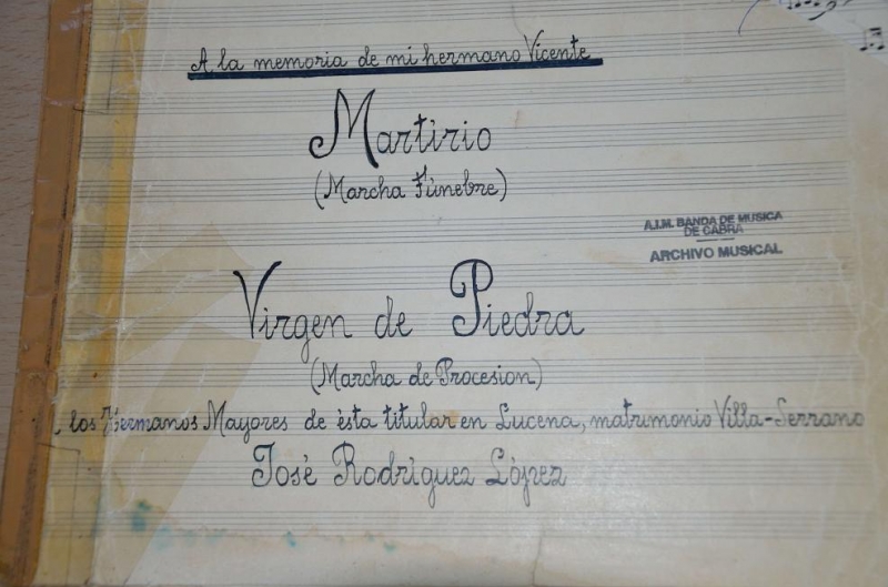 Hace cincuenta años nace la primera marcha procesional en el seno de la banda de música de Cabra, que tengamos constancia hasta la fecha. Curiosamente, esta primogénita composición no está dedicada a ninguna imagen egabrense, sino lucentina. El Maestro Rodríguez tenía una estrecha relación de amistad con Antonio Villa, conocido músico lucentino, de fecunda actividad, que, junto con su mujer, en esos años eran hermanos mayores de una cofradía que procesionaba a una Virgen de las Angustias, que se encuentra sobre una piedra, de ahí el título de la composición. A esta imagen y al matrimonio Villa-Serrano (tal y como reza en la partitura) dedicó su primera marcha, una de las obras más bellas del acervo musical de la Semana Santa lucentina y también una música inherente de la Semana Santa egabrense, que se ha cultivado en nuestras estaciones de penitencia, año tras año durante medio siglo, constituyéndose hoy día como una de las melodías más especiales de la memoria colectiva sonora de nuestro pueblo.