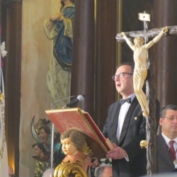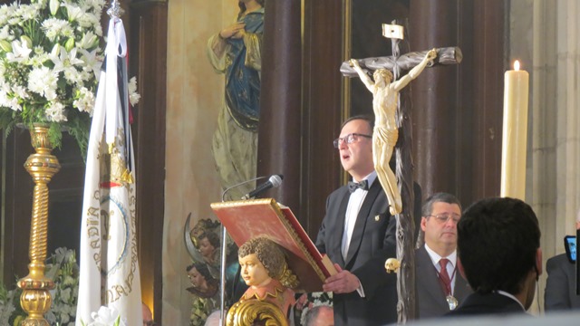 Llegó la Comunión y aquí escuchamos una de las composiciones musicales que más me gustan (quizás la que más) hecha por un músico-compositor de Cabra, Francisco Moral León, fundador del Centro Filarmónico Egabrense. La bellísima "Oración a María" que el tenor lucentino Enrique Reyes, la cantó, la bordó y se lució poniendo toda su alma en ella. Después me dijo que a él la emoción le embarga cuando la canta y que no era la primera vez que lo hacía. La orquesta la acompañó con una orquestación escrita por Antonio Villa y el coro estuvo espléndido en su parte final junto al tenor solista, que realiza varios agudos.