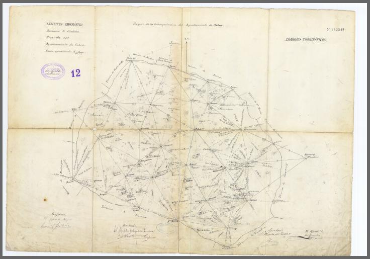 Ilustración: Delimitación del término municipal de Cabra, según datos de 1870 y 1871, sobre gráfico de triangulación del municipio que sirvió de base para la toma de datos y ejecución del Mapa Topográfico a escala 1:50000. Firmado por el Director de Instituto Geográfico D. Carlos Ibáñez e Ibáñez de Ibero.