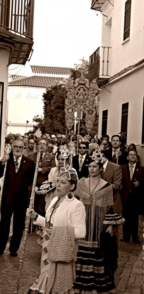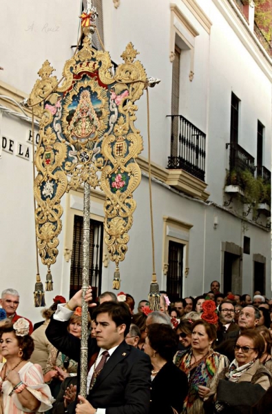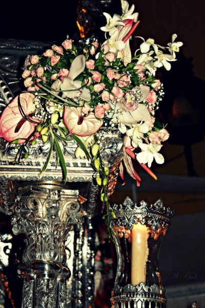 El viernes 15 a las siete de la tarde llegaba a la Parroquia de la Trinidad el Simpecado de nuestra querida hermandad de Cabra. Su párroco nuestro paisano y amigo Jose Juán J. Güeto nos recibía en la puerta con un abrazo cordial y nos invita a pasar a una de las más importantes parroquias de Córdoba. Nos reciben hermanos de las hermandades de la Santa Faz y del Viacrucis y otros feligreses que como si fueran parte de nuestra propia hermandad se pusieron enseguida a montar un precioso altar para la Madre de Dios la Virgen del Rocío. Nos ofrecieron todo lo necesario para que quedara lo más digno posible. Como disfrutó Jose Juan cuando vio la bandera de su querida Virgen de la Sierra presidiendo el altar junto al Simpecado de Ntra Señora, noté como sus ojos resplandecían y se me abrazaba emocionado. Más tarde tuvimos que marchar para ver el espectáculo ecuestre programado para tal evento en las Caballerizas Reales. Este precioso espectáculo estaba presidido por las cinco carretas de las hermandades ya adornadas con el exorno floral, Destacaba de una manera especial la de Cabra. Nos habíamos esmerado mucho en el arreglo floral, como siempre lo hacemos , pero esta vez tenía que ser algo distinto. No era la romería, era la celebración de la Fe rociera, de la fe en la Madre de Dios y en su divino Patorcillo. No , no podía ser igual. Y quien mejor que nuestro querido amigo Manolo Herrero para esto. El ha adornado la carreta muchas veces y sabe perfectamente lo que le va bien, pero esta vez eligió la combinación perfecta, orquídeas, rosas, dandrobios, rosas de pitiminí, y otros tipos de flores preciosas dentro de la gama de color rosa y malva perfectamente combinados. A este arreglo contribuyo también otro gran artista del adorno floral como es nuestro hermano Manolo Chacón. El resultado queda manifiesto en las miles de fotografías que se realizaron. Nuestra carreta causó admiración.