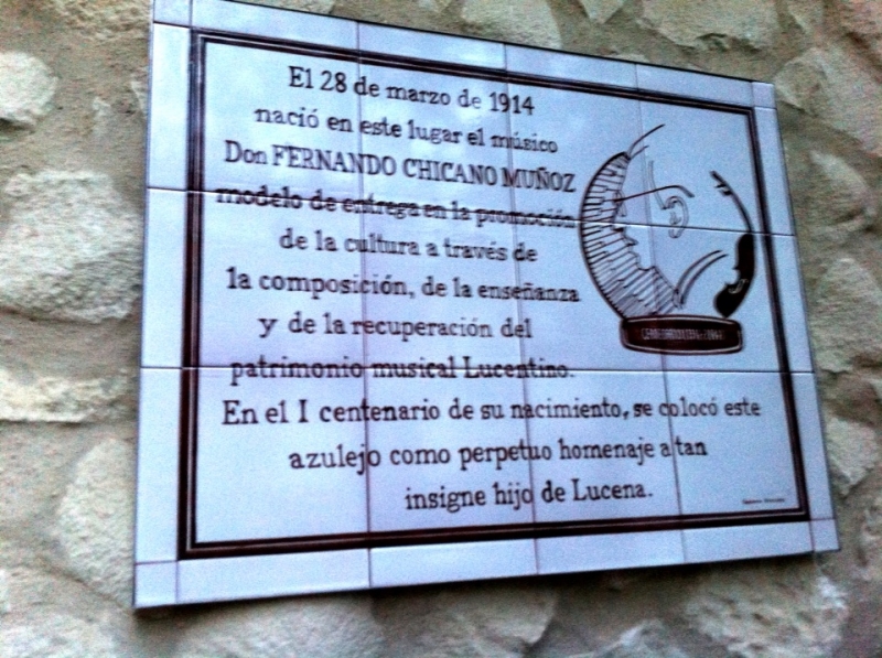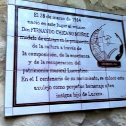 El pasado 27 del corriente fue el arranque de las conmemoraciones con el descubrimiento de un AZULEJO recordatorio de su figura, inserto en la fachada de la casa que le vio nacer en la calle Lademora, 10, acto que estuvo presidido por el Alcalde de Lucena y el Concejal de Cultura junto con toda la familia del Maestro Chicano y en el que intervino la Orquesta de Pulso y Púa, que hizo algunas composiciones del Maestro.