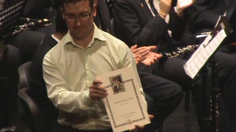 Primer estreno, "Junto a la Cruz" de Manuel González Rubio, compuesta para conmemorar el 30º aniversario de la Cofradía del Stmo. Cristo del Calvario. Es música de capilla y la interpretó el Grupo de Capilla de la Banda de Cabra compuesto por dos saxofones (bajo y tenor) y dos clarinetes. Invita al recogimiento y la oración. Tiene dos partes diferenciadas, la primera melancólica con ritmo pausado y la segunda esperanzadora. Bien lograda, tras su interpretación, recibió de manos de su autor la partitura original, el Hermano Mayor de la Cofradía, José Campillos López, entre los aplausos de los asistentes.