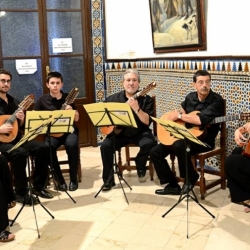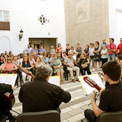 Poco después, el patio de la Oficina Municipal de Turismo nos acogía cuando la tarde empezaba a declinar. Los asistentes ocuparon asiento para escuchar atentamente la ilustrada palabra de Rafael Luna refiriéndose a la fuente de la Plaza Vieja y haciendo alusión a la desaparecida fuente de las ranas, Antonio Suárez leía el "Romance de la rosa en la fuente" de Pedro Iglesias Caballero y Plectroarmonía interpretaba el "2.º Tpo. del Concierto en Re Mayor para guitarra y orquesta" de Antonio Vivaldi. Aún nos esperaba en el recorrido la fuente de la placeta de San Agustín, el arco de la Puerta del Sol y la Glorieta de Colombia, en la que el Grupo de Cuerda se sumó a la conmemoración del 50 aniversario de la muerte del compositor y guitarrista granadino Ángel Barrios interpretando "Zacateque".