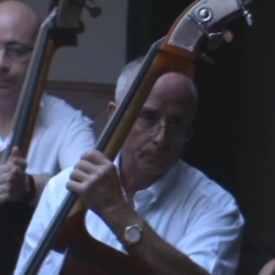 Y por último, cuando un elemento nuevo pasa a formar parte de la Orquesta, se le presenta a Vdes. Es el contrabajista Francisco Ruiz Ginés, que tiene el mérito de venir desde Rute, donde reside, a todos los ensayos y actuaciones en su automóvil y con su instrumento, que no es pequeño". (Risas)
