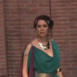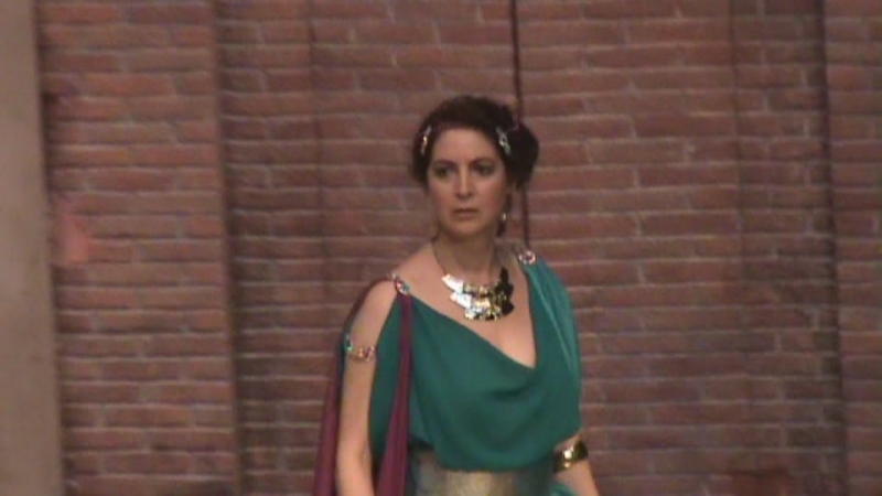 Se fue desarrollando la trama, que duró casi 2 horas y en ese tiempo en la primera escena vimos a una Vendedora de Esclavos (Nuria Martínez) con varios de ellos; vendió a la Esclava Reproductora Fertilia (Charo Ascanio) -qué seguridad en toda su actuación- a la señora Calpurnia y otras dos esclavas Oleosis (Mª José Martínez) y Fregatorix (Maribel Urbano) incluido el plumero, fueron a parar a la casa de Licusia, como cortesanas.