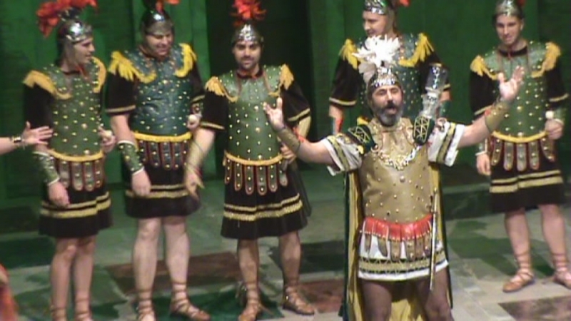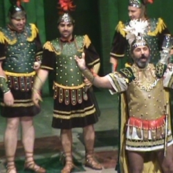 Pero por desgracia Philia la había vendido Licusia a un engreído capitán romano, Miles Gloriosus (Manuel Calvo-Malu) quien realizó un trabajo actoral espléndido. Su aparición en escena fue con traje de romano, así como los 5 soldados que le acompañaban, trajes que todos conocimos enseguida como pertenecientes a la Real Archicofradía de Nuestro Padre Jesús en el Santo Sepulcro e Imperio Romano de nuestra ciudad.
