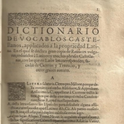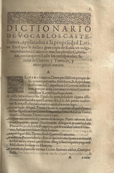 Dictionario de vocablos castellanos aplicados a la propriedad latina : en el qual se declara gran copia de Refranes vulgares reduzidos a latinos y muchas phrases Castellanas con las que en Latin les corresponden sacadas de Ciceron y Terencio y otros graues autores : con vn Indice copioso de los Adagios Latinos a los quales responden los Castellanos ... / compuesto por ... Alonso Sanchez de la Ballesta. -- En Salamanca : en casa de Iuan y Andres Renaut impresores, 1587