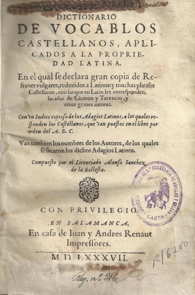 En 1587, ve la luz en Salamanca la primera y única edición del "Dictionario de vocablos castellanos aplicados a la propiedad latina" de Alonso Sánchez de la Ballesta. Se trata de un repertorio español-latino de 10.600 entradas, entre las que se encuentran numerosas formas pluriverbales, ya sean frases proverbiales, refranes o citas tomadas de autores latinos. Un ejemplar de la primera y única edición se encuentra en la Biblioteca Histórica Aguilar y Eslava.