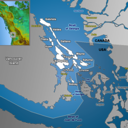 Hasta aquí la cita en el artículo de Marina Alfonso Mola y Carlos Martínez Shaw alusiva a Dioniosio Alcalá Galiano. Debemos recordar, por otra parte, que aquella expedición, iniciada el 8 de marzo de 1792 para recorrer y cartografiar el estrecho de Fuca, pudo comprobar meses después que no había salida al Océano Atlántico. Como testimonio del acontecimiento científico tenemos el nombre de Isla Galiano dado a una de las Islas del Golfo meridionales, entre la Isla de Vancouver y la costa pacífica de la Columbia Británica, Canadá. Se encuentra, por tanto, en el Estrecho de Georgia, y junto a ella la Isla Valdés, recordando también al otro marino, Cayetano Valdés, que mandaba la goleta Mexicana, siendo el jefe de la expedición Alcalá Galiano, comandando la Sutil.
