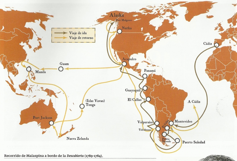 El nombre de Dionisio Alcalá Galiano (Cabra, 1760-Cabo Trafalgar, 1805) aparece nuevamente citado cuando describen que las naves tenían el propósito de intervenir, aunque indirectamente, en el conflicto que enfrentaba a nuestro país con Inglaterra en torno a la bahía de Nutka, mientras se buscaba el paso del Noroeste en las costas de Canadá y de Alaska. Malaspina había establecido relaciones con los nativos de Mulgrave y con los de Nutka, pero en este paso del noroeste y a la altura del Puerto del Desengaño los barcos tenían que volverse, al no encontrar ninguna salida.