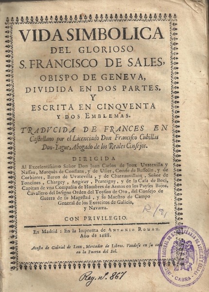 Vida simbolica del glorioso S. Francisco de Sales ... : dividida en dos partes y escrita en cinquenta y dos emblemas / [por Adrian Gambart] ; traducida de frances en castellano por ... don Francisco Cubillas Don-Yague ... -- En Madrid : en la Imprenta de Antonio Roman : a costa de Gabriel de Leon ..., vendese en su casa ..., 1688