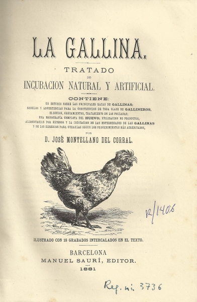 La Gallina : tratado de incubación natural y artificial ... / por José Montellano del Corral. -- Barcelona : Manuel Saurí, 1881