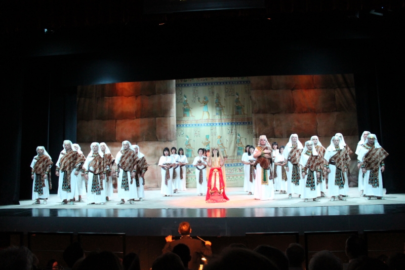 Se abrió el telón para que escuchásemos a los cantantes representando los personajes de la historia egipcia, que relata el libreto de Antonio Ghislazoni y que ni más ni menos es la de un triángulo amoroso entre la esclava etíope Aida, la hija del faraón, Amneris y el general egipcio Radamés. "Aida no es en si mismo una ópera histórica. Es una ópera de fantasía con la verdad del melodrama" (Hugo de Ana. Dtor. de escena. Teatro Real de Madrid. 1.998).