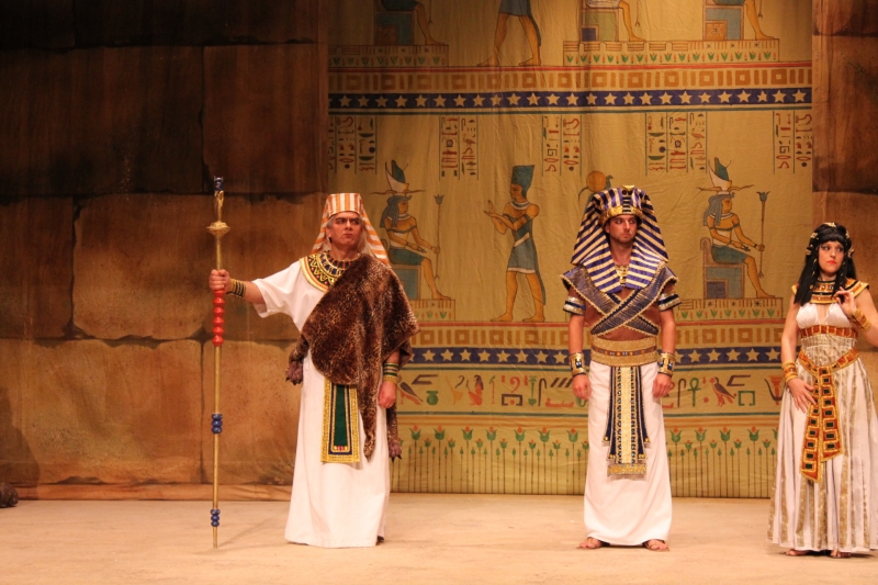 Una escenografía minimalista pero suficiente para adentrarnos en la acción, que está situada en la Menfis y Tebas del tiempo de los faraones del Imperio Nuevo de la Dinastía XIX o XX, fue la que sirvió para que el Director de Escena catalán Carles Ortiz (lo veríamos en el papel secundario de Mensajero-tenor) ligado a la Ópera de Sabadell y la de Cataluña realizase su labor con los cantantes, para que sus papeles actoralmente fuesen perfectos y sin desajustes.