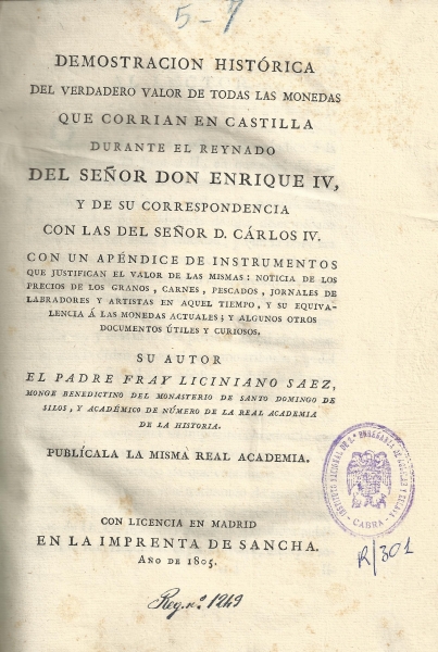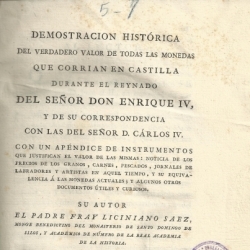 Demostración histórica del verdadero valor de todas las monedas que corrían en Castilla durante el reynado del Señor Don Enrique IV y de su correspondencia con las del Señor D. Carlos IV : con un apéndice de instrumentos que justifican el valor de las mismas ... / su autor ... Fray Liciniano Sáez, monge benedictino ... y académico de número de la Real Academia de la Historia ; publícala la misma Real Academia. -- Madrid : [s.n.], 1805 (en la Imprenta de Sancha)