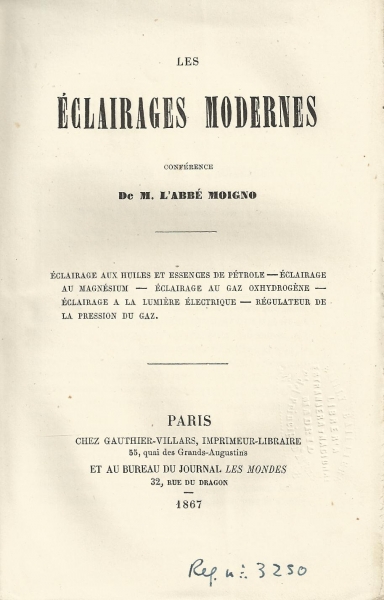 Les éclairages modernes / conférence de M. L"abbé Moigno. -- Paris : Chez Gauthier-Villars, imprimeur-libraire : et au Bureau du journal Les Mondes, 1867 (Typographie Walder)