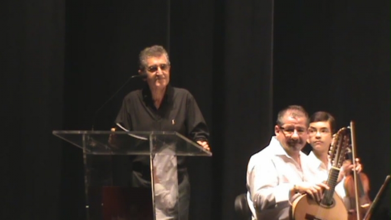 Con un teatro prácticamente lleno y la presencia del Sr. Alcalde, Fernando Priego y los concejales de Cultura y Feria y Fiestas, Javier Ariza y Mª José Villatoro respectivamente, el Presidente del C.F.E. Eustasio Moreno abrió el acto a las 21 horas, pronunciando unas palabras para presentar el concierto y al nuevo director artístico. En el escenario ya estaban situados la Orquesta y Coro. Para este acto las féminas lucían sus vestidos negros y unos "foulards" con los colores de la bandera de Cabra y la de la Virgen de la Sierra, que coinciden, o sea blanco, amarillo, rojo y verde.