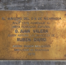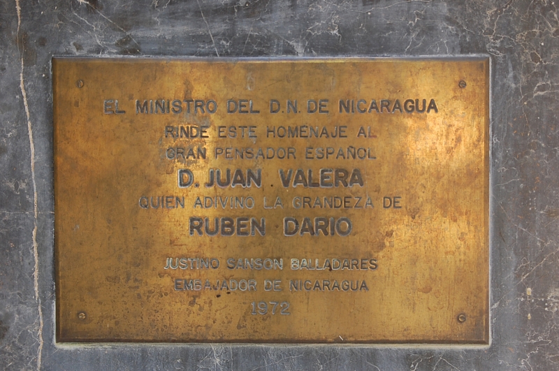 En noviembre de 1972 se coloca la placa que figura en el monumento a Don Juan Valera en la Paseo Alcántara Romero. La inscripción dice: "El Ministro del Distrito Nacional de Managua, rinde homenaje al gran pensador español Don Juan Valera, quien adivinó la grandeza de Rubén Darío". La placa viene firmada por el embajador de Nicaragua en España, Justino Sansón Balladares, promotor de la idea, visitante asiduo a la tierra natal de Valera, con estrechas amistades en ella y personaje que suscita ciertas controversias en algunos círculos locales (recaudación de la campaña "pro-Managua" ante el trágico terremoto en la ciudad nicaragüense el 23 de diciembre de 1972 y que de manera ejemplar Cabra y su comarca se movilizó a través de Radio Atalaya, consiguiendo una importante ayuda económica y material).