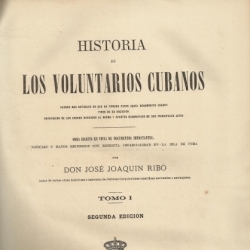 Historia de los voluntarios cubanos : hechos más notables en que ha tomado parte aquel benemérito cuerpo, fines de su creación, refutación de los cargos dirigidos al mismo ... / por José Joaquín Ribó.-- 2ª ed.-- Madrid : [s.n.], 1872-1876 (imprenta y litografía de Nicolás González)