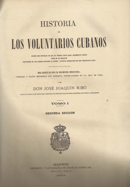En 1872 ve la luz en Madrid, en la Imprenta y Litrografía de Nicolás González, la segunda edición del Tomo I de la "Historia de los Voluntarios Cubanos" de José Joaquín Ribó, autor de varias obras históricas e individuo de distintas corporaciones científicas nacionales y extranjeras, según aparece reseñado en la portada del libro. Esta historia de los voluntarios cubanos está publicada en dos volúmenes, localizándose en la Biblioteca Histórica Aguilar y Eslava solamente un ejemplar del primer tomo, el que hoy traemos como "Libro de la Semana". El segundo volumen está editado en 1876.