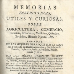 "Memorias instructivas, útiles y curiosas sobre agricultura, comercio, industria, economía, medicina, química, botánica, historia natural, etc.", sacadas de las mejores obras por Miguel Jerónimo Suárez y Núñez (Madrid, 1791)