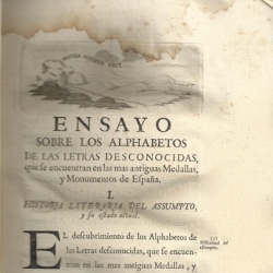 "Ensayo sobre los alphabetos de las letras desconocidas que se encuentran en las más antiguas medallas y monumentos de España" por Luis Joseph Velázquez (Madrid, 1752)
