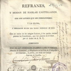 "Refranes, modos de hablar castellano, con los latinos que les corresponden y la glosa y explicación...", compuesto por Jerónimo Martín Caro y Cejudo (Madrid, 1792)