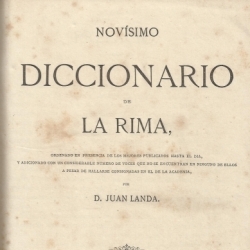 En la portada de este "Novísimo diccionario de la rima" de Juan Landa, impreso en Barcelona en 1867, se indica que está ordenado en presencia de los mejores publicados hasta el día y adicionado con un considerable número de voces que no se encuentran en ninguno de ellos, a pesar de hallarse consignadas en el de la Academia. Se justifica su publicación, en el prefacio, "por la absoluta carencia que se advierte de un correcto Diccionario de la rima", subrayando que ese ha sido el motivo esencial para dar a luz la presente obra.