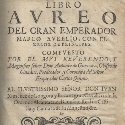 "Libro aureo del gran emperador Marco Aurelio, con el relox de Principes" de Antonio de Guevara (1658), donado por Juan Valera.