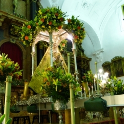 Contemplamos hoy la imagen de Nuestra Señora de la Sierra en la parroquia de la Asunción, preparada para su regreso al Santuario que tendrá lugar en el amanecer del domingo 6 de octubre. Y su estampa nos ofrece una indumentaria que nos recuerda, con gran similitud, la que se presenta en un antiguo óleo del siglo XVIII, que conserva la Real Archicofradía. Podría ser el mismo manto, o es muy similar, el que se nos presenta en aquel lienzo y el que vemos hoy en la parroquia.