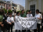 Unas seis personas que portaban una pancarta con el lema "DEMOCRACIA REAL YA" se manifestaban ante las puertas del Ayuntamiento a la hora de la constitución de la nueva Corporación Municipal. Los manifestantes repartieron folletos e informaban acerca de los contenidos de sus reivindicaciones y convocaron a la manifestación que tendrá lugar el próximo domingo 19 de junio a las 21:00h.