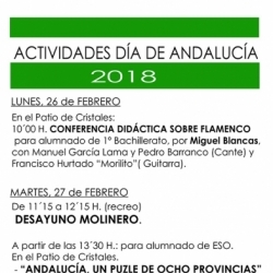 El histórico Instituto Aguilar y Eslava celebra un año más el Día de Andalucía, con una serie de actividades que van a tener lugar este lunes 26 y martes 27 de febrero de 2018 con propuestas para toda la comunidad educativa y familias del centro.