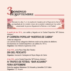 Ya se ha distribuido el programa oficial de la Real Feria y Fiestas de Septiembre en honor de Nuestra Señora, María Santísima de la Sierra, patrona de Cabra. Tanto en papel como en formato digital el programa abre sus actos el jueves 31 de agosto.