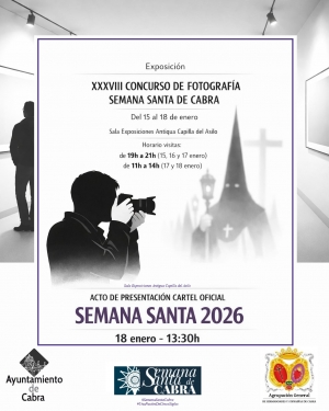 La Agrupación General de Hermandades y Cofradías de Cabra, en colaboración con la Delegación de Feria y Fiestas del Ilustrísimo Ayuntamiento de Cabra, ha organizado la Exposición de Fotografías del XXXVIII Concurso de Fotografías de la Semana Santa, muestra que recogerá las fotografías participantes en la presente edición del certamen.
