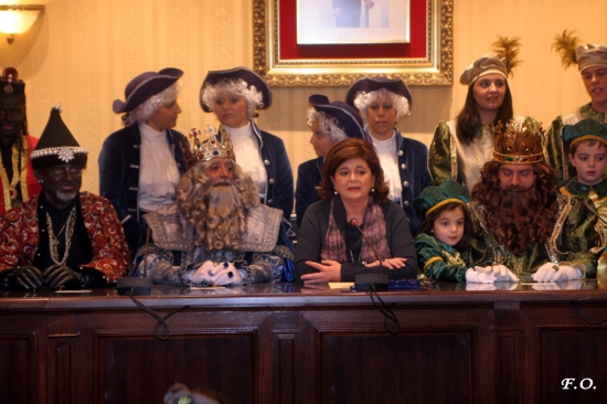 Como suele ser habitual la alcaldesa de la ciudad, Mª Dolores Villatoro, presidió el acto acompañada de los tres reyes a ambos lados y también del presidente de la Asociación Cabalgata de Reyes Magos, Rafael Medina. La regidora ofreció varios presentes a sus Majestades y estos hicieron lo mismo, regalando una fotografía enmarcada al Ayuntamiento y dos detalles más tanto a la alcaldesa como a la concejala de Festejos, Mª del Carmen Güeto. En su breve comparecencia el único de los reyes que habló en el salón fue Gaspar, posteriormente hablaría Melchor desde el balcón principal del Consistorio.